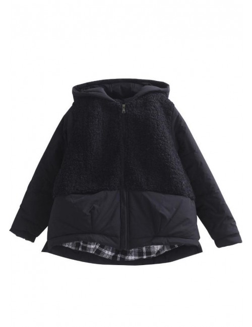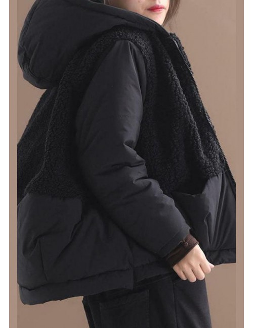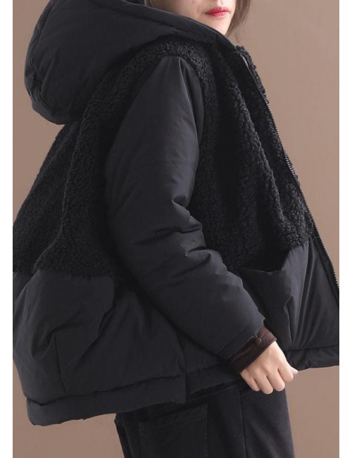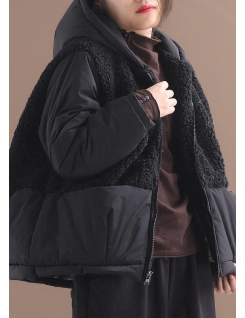 Fashion Black hooded Patchwork Zippered Long Sleeve Winter Coat