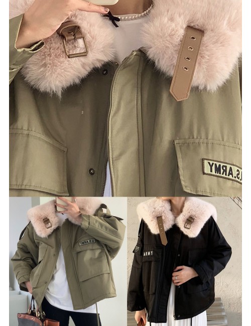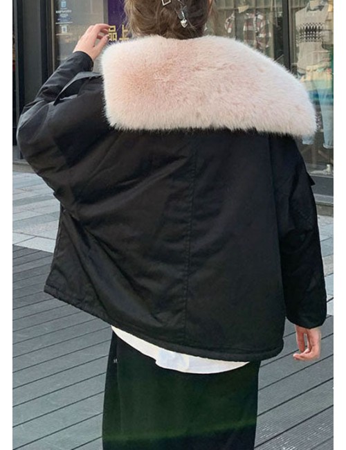 Fashion Black Fox collar Zip Up Fine Cotton Filled Puffers Jackets Winter