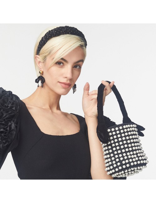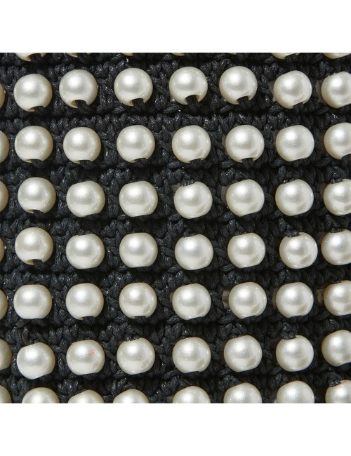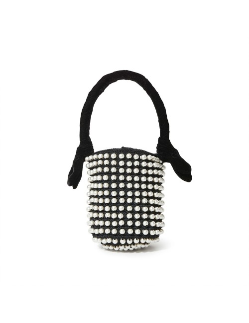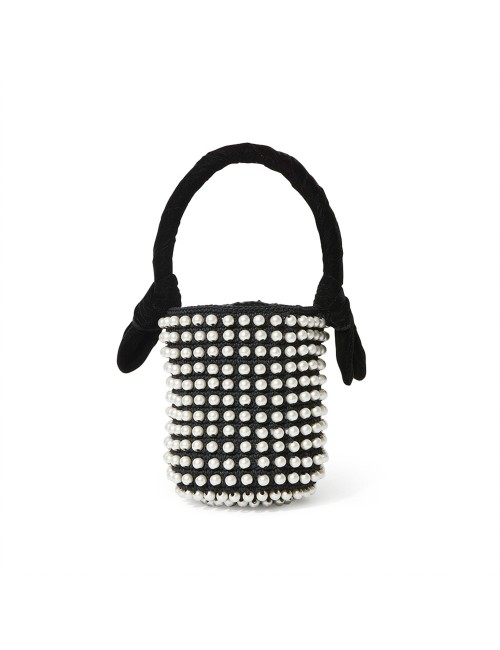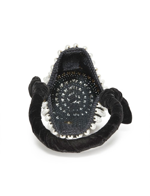 Our crochet bucket bag, the Beatrix. Hand-crocheted in India using hand-applied paillettes.