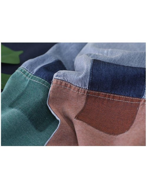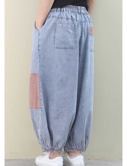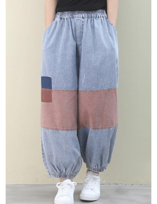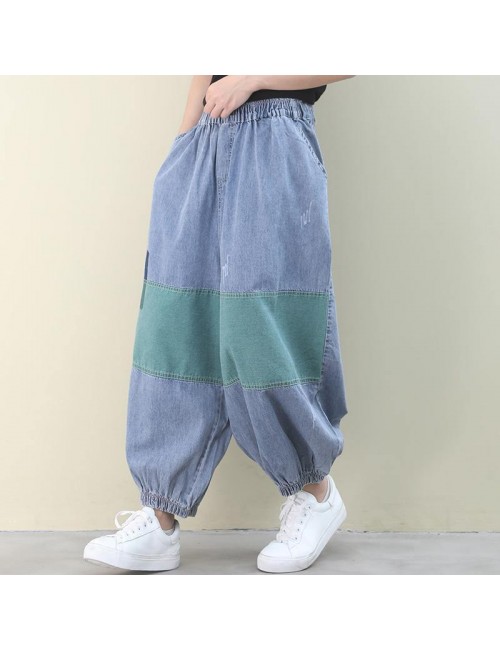 Italian women pants denim blue pattern elastic waist patchwork green trousers